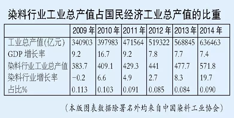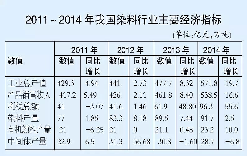 中国染料工业协会给出的一组数据更加具体地展示了中国染料行业这几年的发展成就。根据协会统计,2011~2014年,我国染料行业工业总产值年均增长10%,工业销售收入年均增长8.9%,利税年均增长32.9%,产量年均增长5.9%。2014年,染料产量91.7万吨,染料出口27.13万吨,出口贸易额18.13亿美元,直接出口130多个国家和地区。