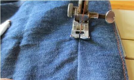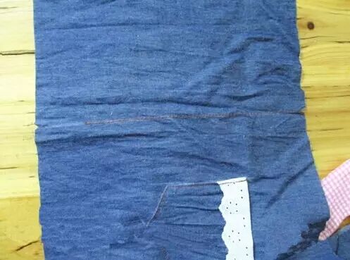 5、在前后裤片中间画一条直线,用牛仔线缝一道装饰线,到离裤脚口4厘米左右为宜。
