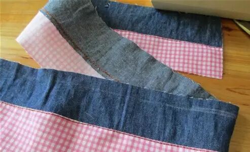 15、做腰头:腰里腰面正面对正面拼合,完了以后将缝份修剪到0.3CM左右,再将缝份倒向腰里压0.1CM明线。